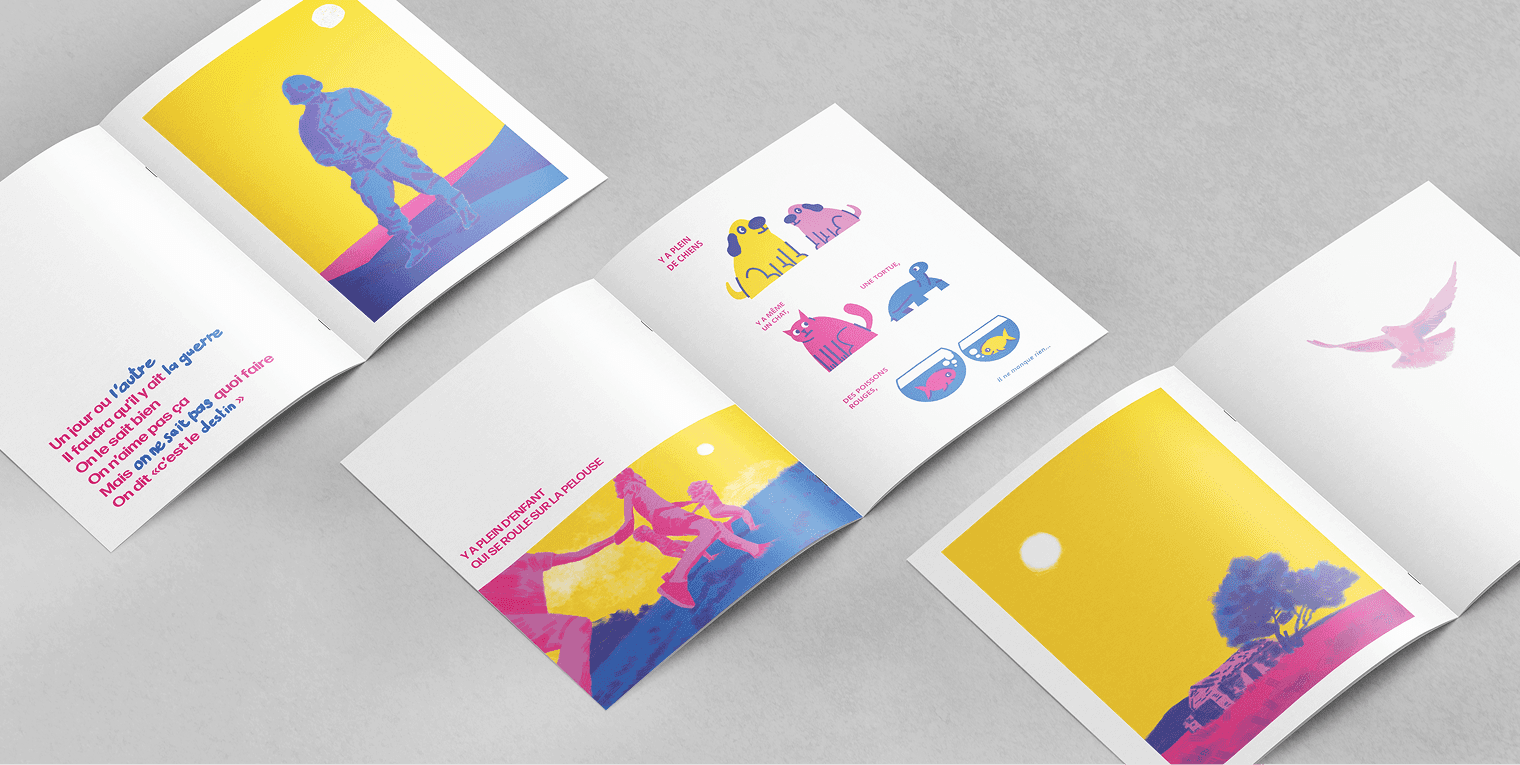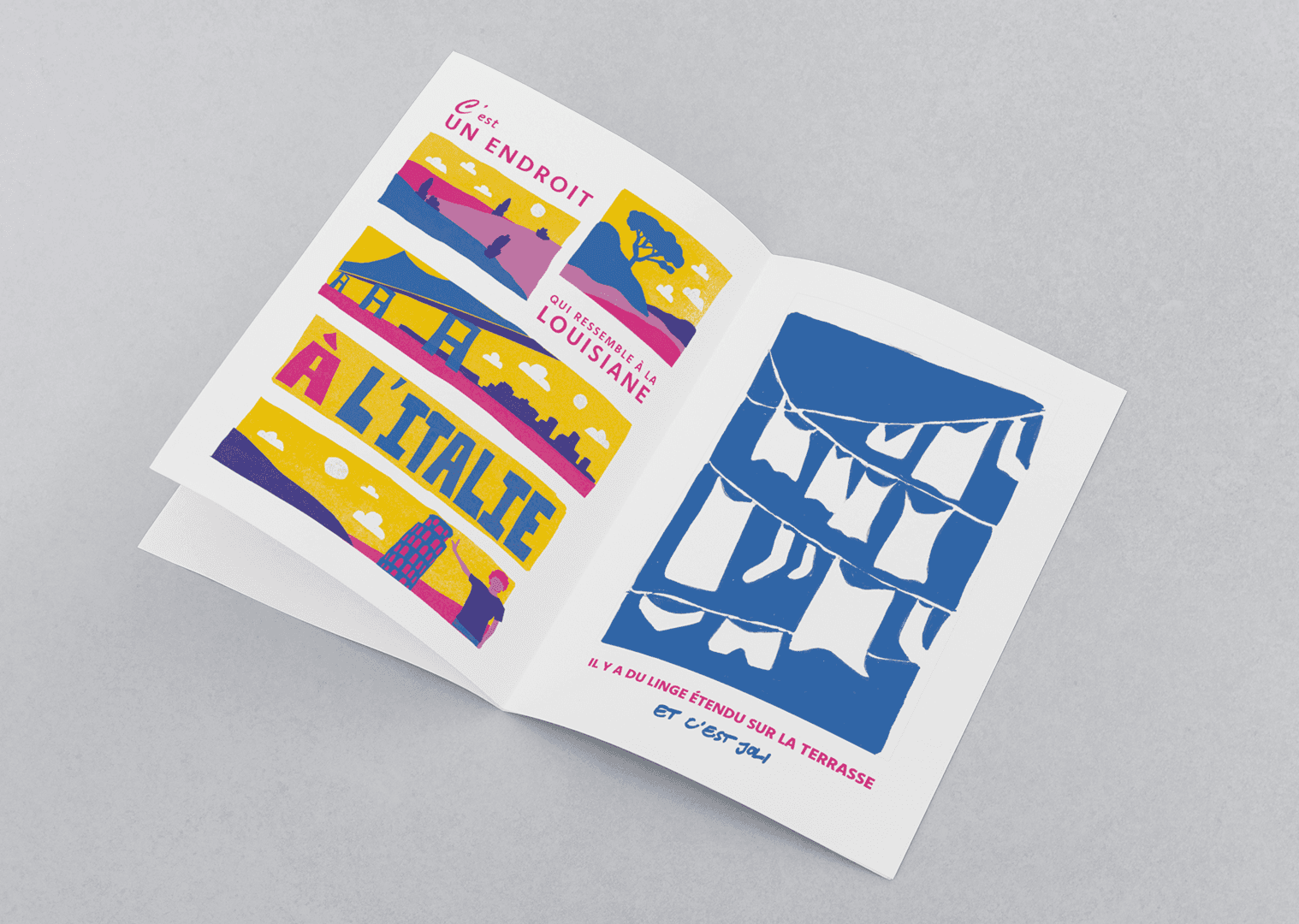 Réinterprétation graphique de la chanson “Le Sud” de Ninno Ferrer. (Impression sur un booklet A5).Ce travail, personnel, tente de traduire visuellement la nostalgie qui émane de cette chanson.