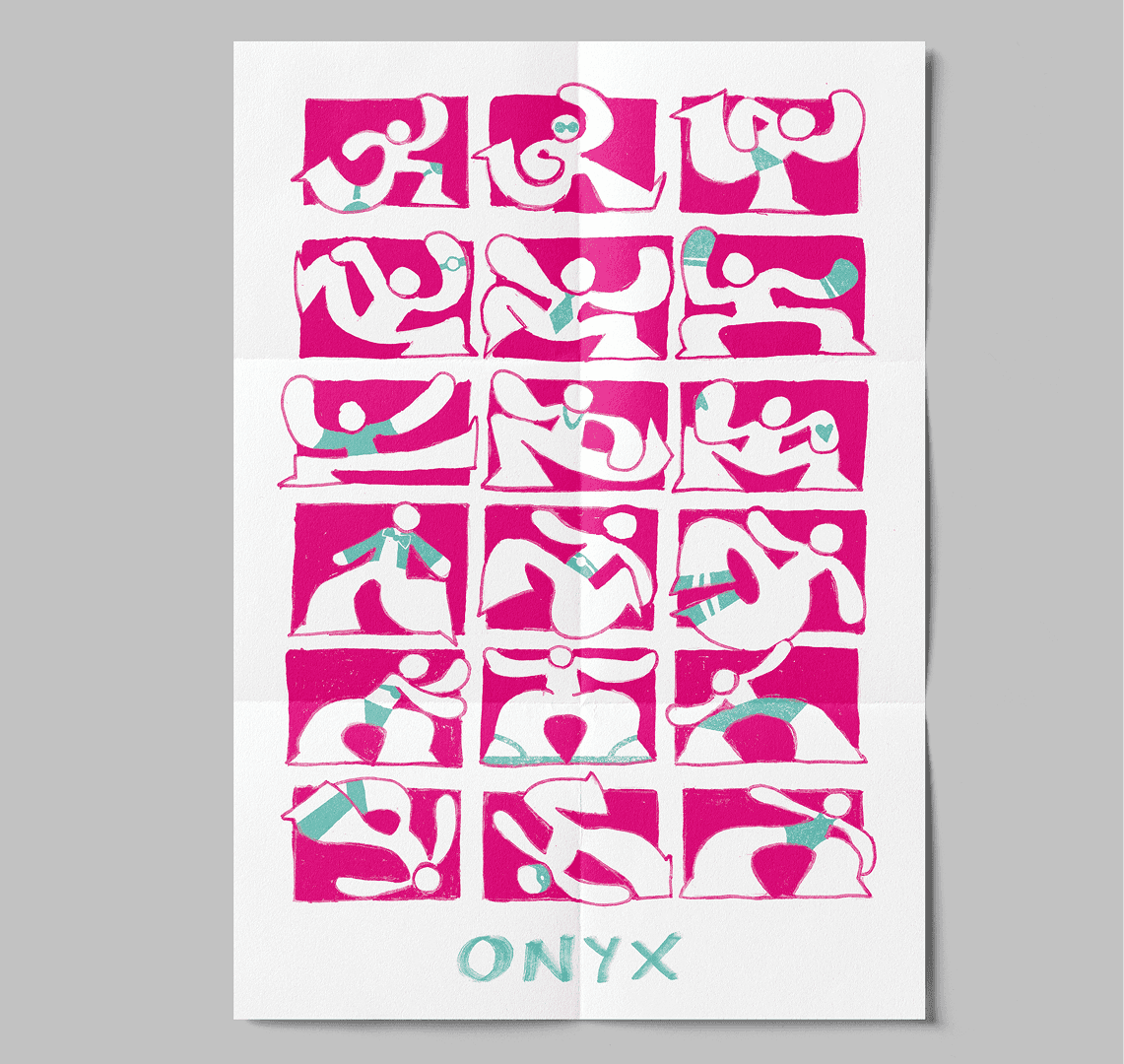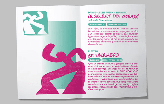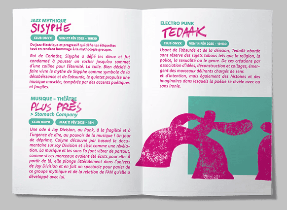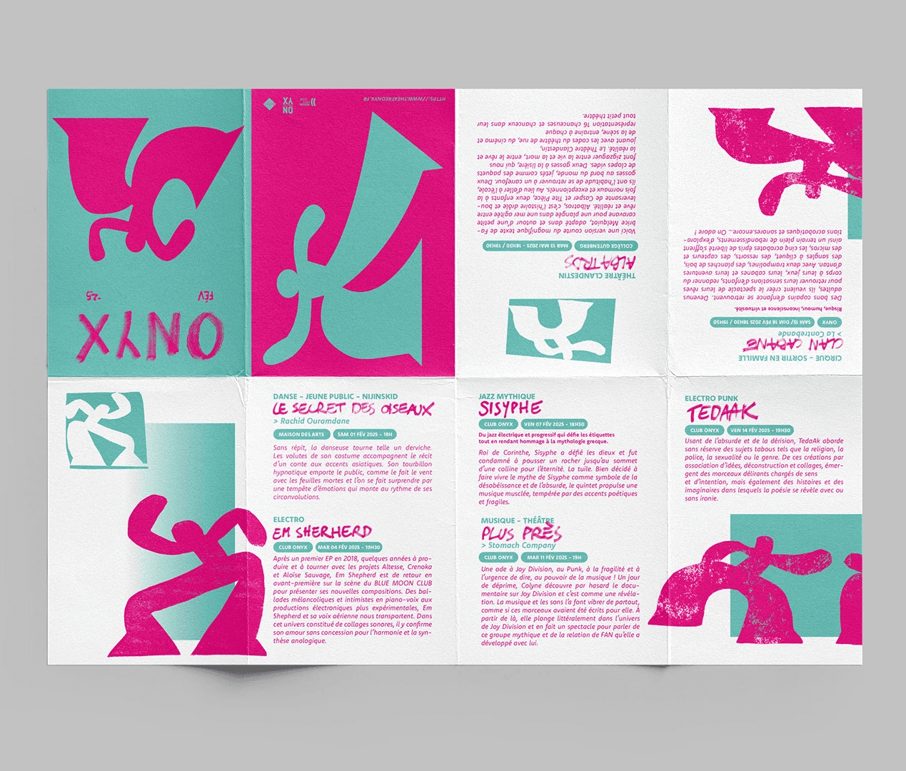 Réalisation fictive de la programmation mensuelle du théâtre Onyx sous la forme d’un poster déplié et d’une brochure repliée.